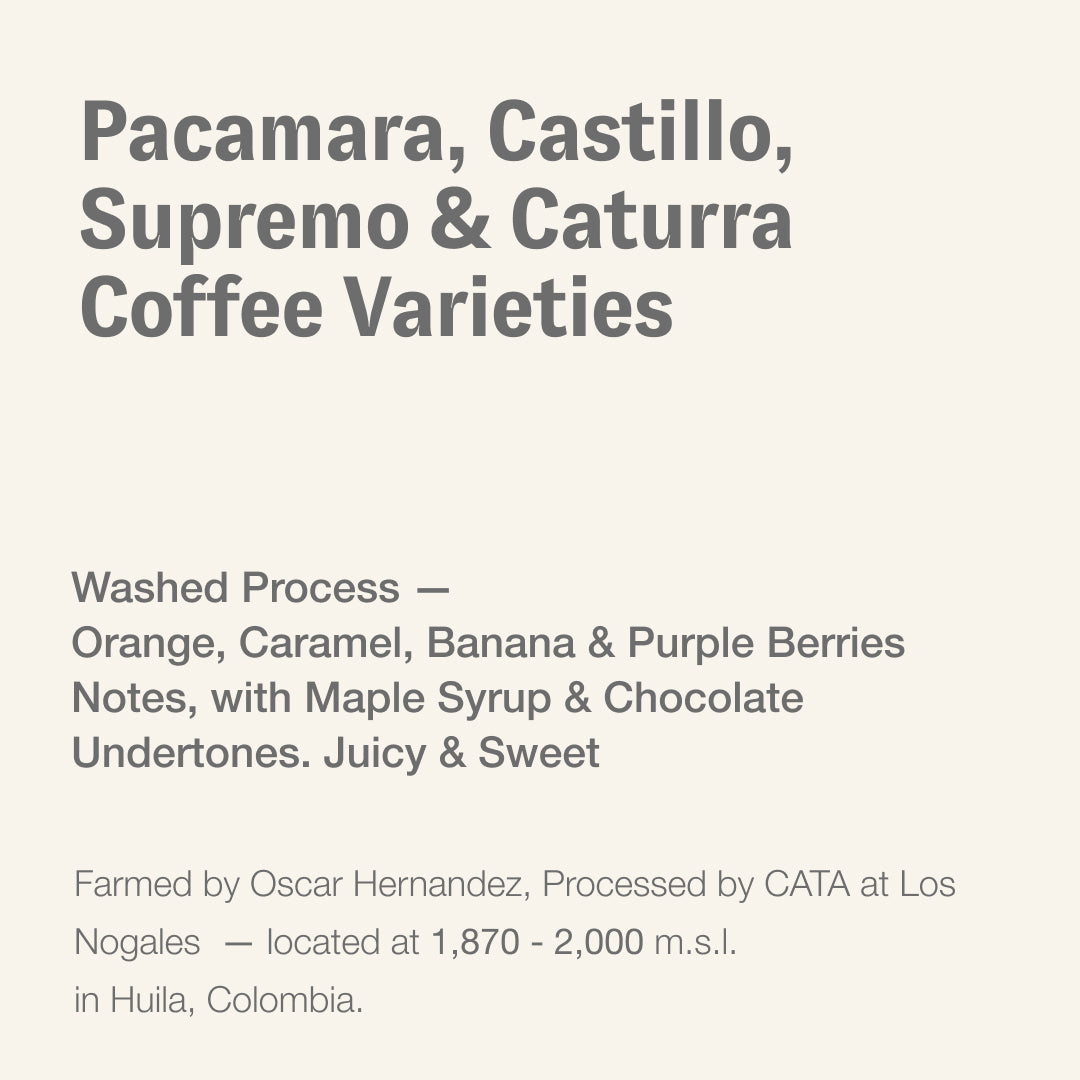 Following the success of our initial Semi-washed lot release, we are excited to present this coffee once more, now as a vibrant, clean washed version. This edition highlights the power of collaboration and expertise throughout the coffee supply chain. Drawing on insights from roasters and the deep processing and farming knowledge at Los Nogales farm—led by Oscar Hernandez in partnership with CATA—a consistent and versatile coffee profile has been crafted. It reflects the dedication and straightforward approach of Huila’s hardworking community. The unique terroir, innovative techniques, and careful efforts of collectors and farm partners have produced an outstanding coffee. Now, it’s your turn to savor this exceptional creation.